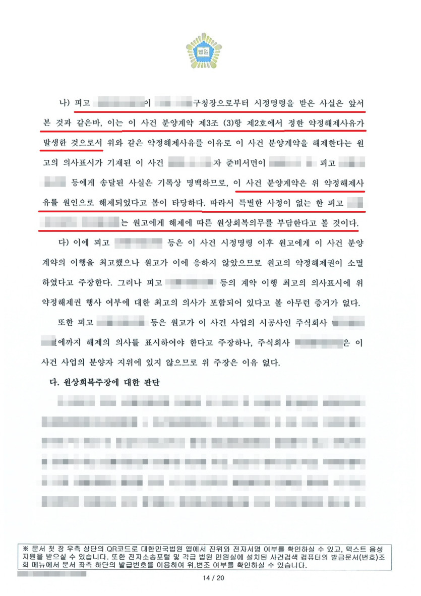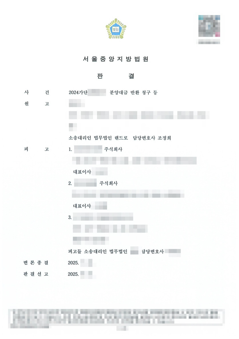 저희 법무법인 랜드로도 건분법 위반으로 시정명령을 받은 부산 분양 현장에서 수분양자를 대리하여 분양계약 해제를 이끌어냈습니다.
