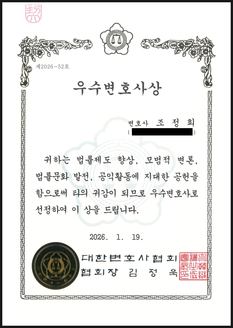 조정희 변호사가 2026년 대한변호사협회 우수변호사로 선정되어 수상의 영예를 안게 되었습니다.
