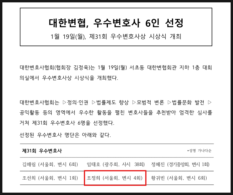 이번 대한변협 우수변호사상 수상 소식은 아래 링크 기사를 통해서도 확인하실 수 있습니다.